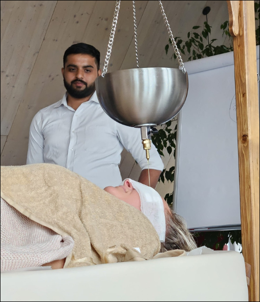 - Shirodhara: A steady stream of warm herbal oil is gently poured on the forehead (third-eye region). Deeply relaxes the mind, balances hormones, and improves sleep.