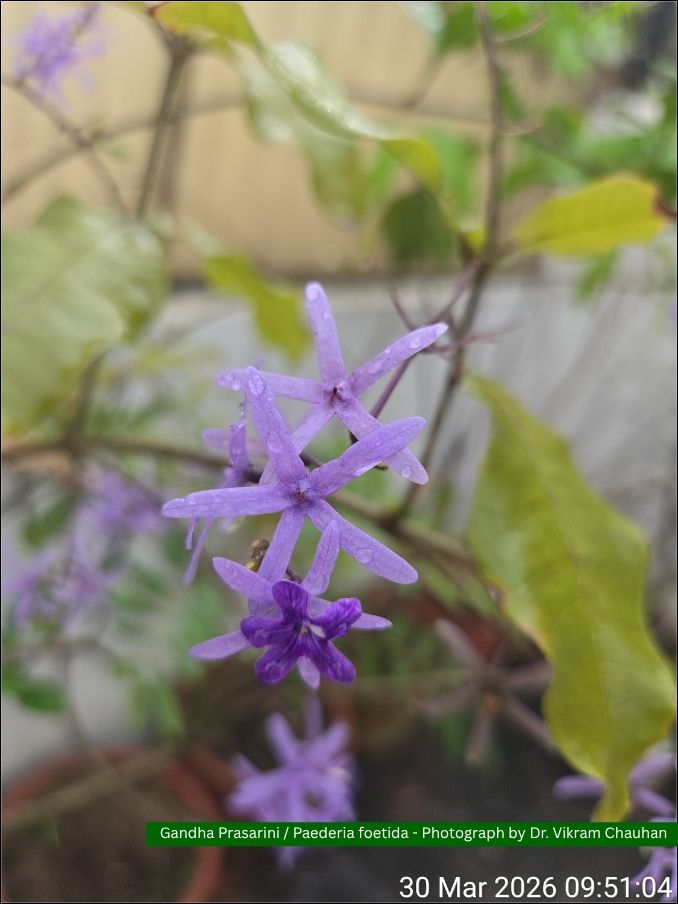 Gandha Prasarini (Paederia foetida) is a climber plant which has ovate to lanceolate leaves. Gandha Prasarini leaves are around 5 cm long and 2.5 cm in width. The leaves are also membranous and have long petioles. Gandha Prasarini flowers are found in scorpiod cymes and are purple or violet in color. Gandha Prasarini roots are cylindrical or sub cylindrical and compressed on both sides, with an outer surface covered in root scars. The fruits are compressed, ellipsoid, red or black in color. It is fibrous, the exterior is brownish and the internal color is light brown, with a bitter taste.